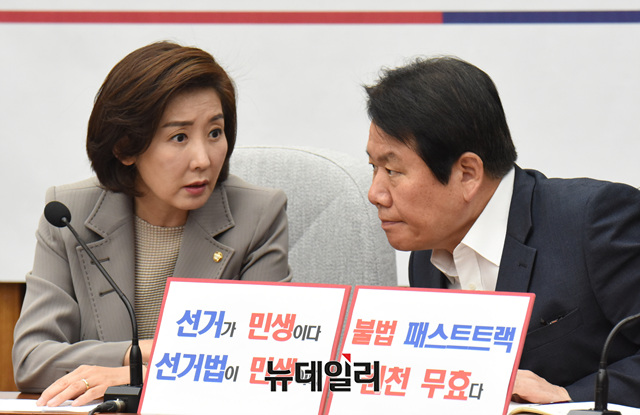 나경원 자유한국당 원내대표와 정양석 원내수석부대표가 3일 오전 국회에서 열린 민생경제 원내대책회의에서 대화하고 있다.