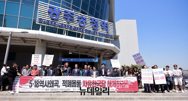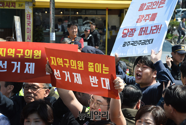 자유한국당이 주최한 '문재인 STOP! 광주시민이 심판합니다!' 규탄대회가 3일 오전 광주송정역 광장에서 열린 가운데 좌파단체가 한국당 규탄대회를 반대하며 시위를 하고 있다.