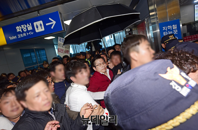 황 대표는 자유한국당의 해체를 주장하는 좌파단체의 거센 항의에 역사 귀빈실로 대피했다. (광주=박성원 기자)