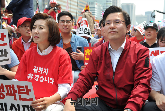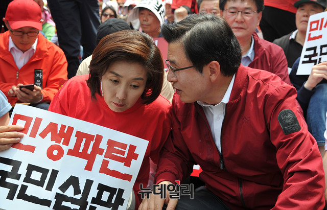 황교안 자유한국당 대표와 나경원 원내대표가 4일 오후 서울 종로구 세종문화회관 앞에서 열린 '문재인 STOP!, 국민이 심판합니다!' 3차 규탄대회에 참석해 대화를 나누고 있다.