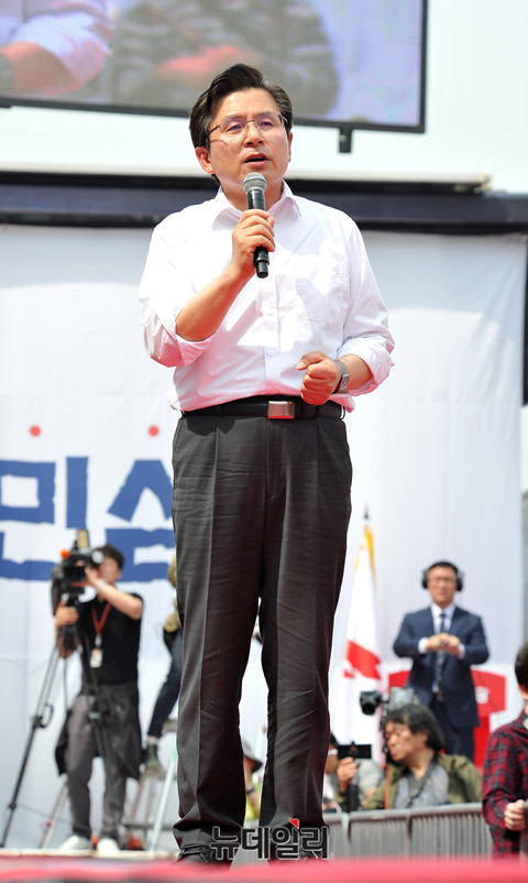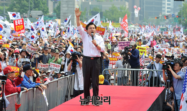 황교안 자유한국당 대표가 4일 오후 서울 종로구 세종문화회관 앞에서 열린 '문재인 STOP!, 국민이 심판합니다!' 3차 규탄대회에 참석해 발언을 하고 있다.