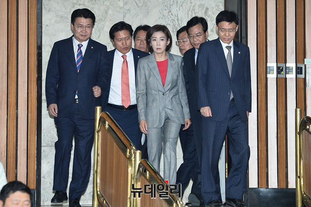 나경원 자유한국당 원내대표와 한국당 의원들이 7일 오전 국회에서 열린 외교안보 원내대책회의에 참석하고 있다.