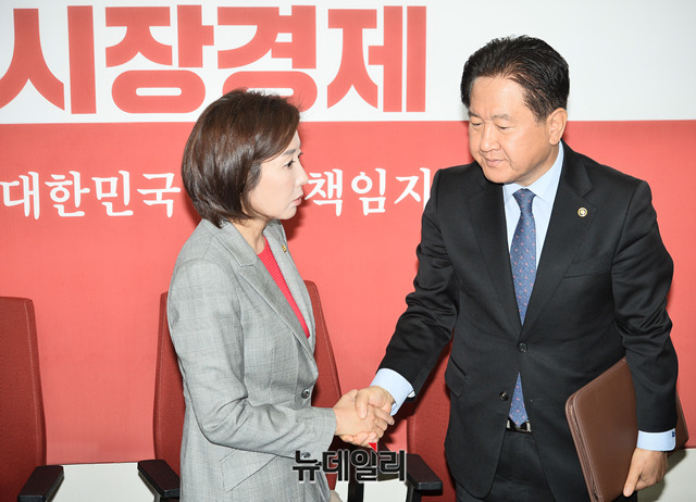 나경원 자유한국당 원내대표가 7일 오전 국회에서 북한 발사체와 관련해 서주석 국방부 차관의 예방을 받고 악수를 하고 있다.