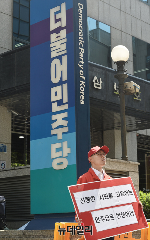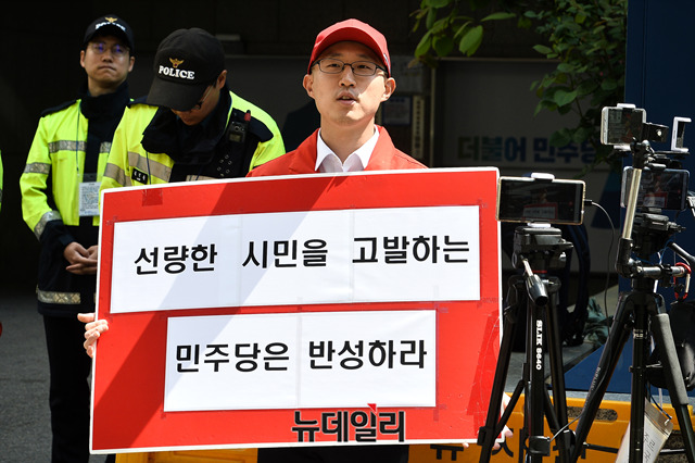 김준교 전 자유한국당 청년최고위원 후보가 7일 오전 서울 여의도 더불어민주당 중앙당사 앞에서 국회 패스스트랙과 관련해 자유한국당 의원 18명과 본인을 공무집행방해와 공공기물 파손 등 각종 폭력행위로 검찰에 고발한 것에 반발하며 1인 시위를 하고 있다.