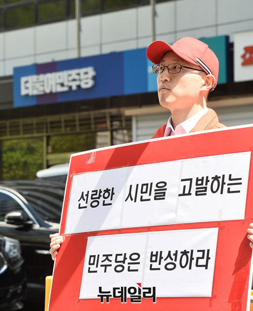 김 전 후보는 "국회 본청에서 폭력을 행사하지도 않았던 일반시민(본인)이 유일하게 고발을 당했다"며 "시민을 탄압하고, 갑질하는 민주당에 항의하러 왔다"고 1인시위의 취지를 밝혔다.