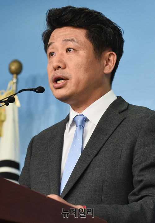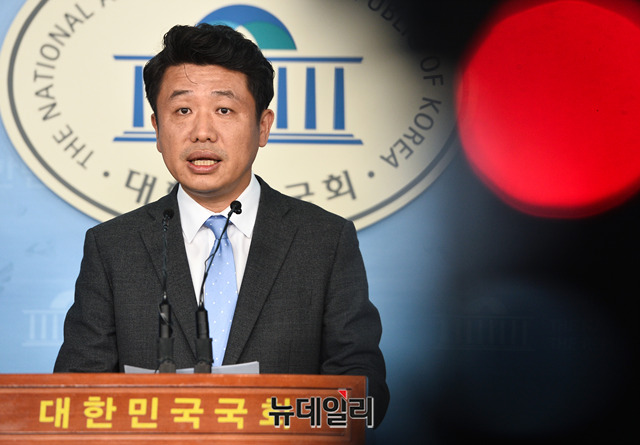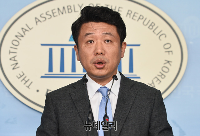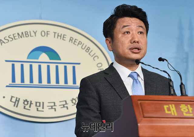 유의동 바른미래당 의원이 7일 오후 국회 정론관에서 김관영 원내대표 사퇴를 촉구하는 기자회견을 갖고 있다.