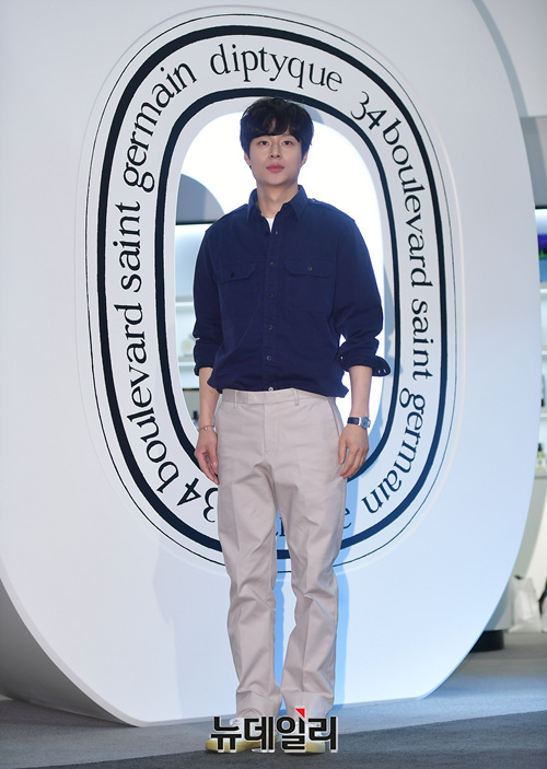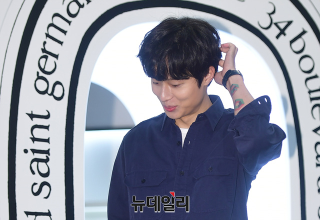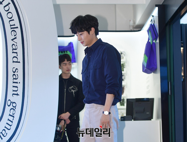 아티스트 김충재가 7일 오후 서울 강남구 '딥디크 프래그런스 팝업스토어' 오픈 행사에서 포토타임을 갖고 있다. 신제품 '오 드 민떼 오 드 퍼퓸' 론칭을 기념해 열린 이번 팝업스토어는 6월 14일까지 운영된다.
