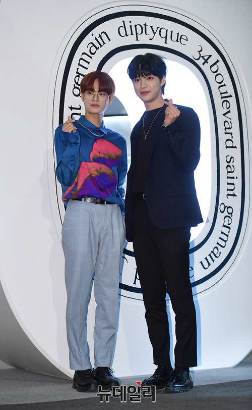 AB6IX 이대휘(왼쪽), 임영민이 7일 오후 서울 강남구 '딥디크 프래그런스 팝업스토어' 오픈 행사에서 포토타임을 갖고 있다. 신제품 '오 드 민떼 오 드 퍼퓸' 론칭을 기념해 열린 이번 팝업스토어는 6월 14일까지 운영된다.