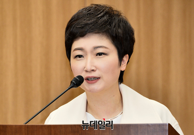 무소속 이언주 의원이 8일 오전 서울 서초구 서울지방변호사회관에서 열린 '패스트트랙 입법지정의 문제점' 주제로 열린 토론회에서 격려사를 하고 있다.