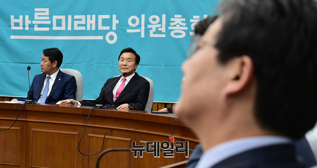 손학규 바른미래당 대표가 8일 오후 국회에서 열린 의원총회에 참석해 유승민 의원을 바라보고 있다.
