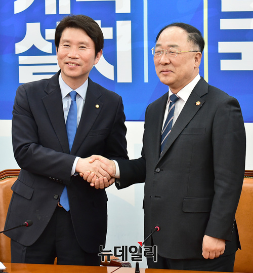 이인영 신임 더불어민주당 원내대표가 9일 오전 국회 원내대표실에서 홍남기 경제부총리 겸 기획재정부 장관의 예방을 받고 악수를 나누고 있다.
