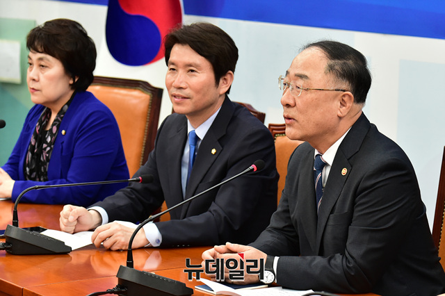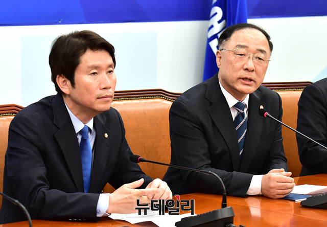 이인영 신임 더불어민주당 원내대표가 9일 오전 국회 원내대표실에서 홍남기 경제부총리 겸 기획재정부 장관의 예방을 받고 환담을 나누고 있다.