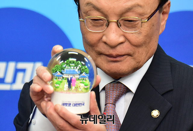 이해찬 더불어민주당 대표가 9일 국회에서 열린 '문재인 정부 출범 2주년 기념 굿즈 런칭 행사'에서 스노우볼 기념품을 들어 보이고 있다. 이번에 공개한 굿즈(기념품)는 오는 13일 더불어민주당 홈페이지에서 구매할수 있다.