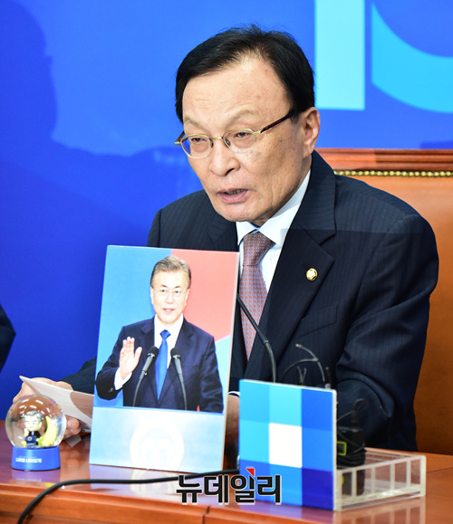 이해찬 더불어민주당 대표가 9일 국회에서 열린 '문재인 정부 출범 2주년 기념 굿즈 런칭 행사'에서 모두발언을 하고 있다.이번에 공개한 굿즈(기념품)는 오는 13일 더불어민주당 홈페이지에서 구매할수 있다.