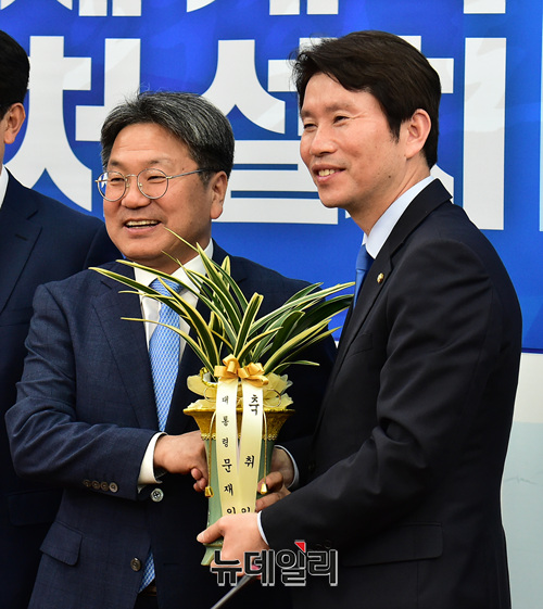 [포토] 이인영 신임 민주당 원내대표 찾은 강기정 정무수석