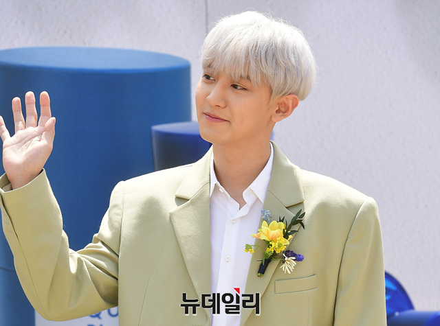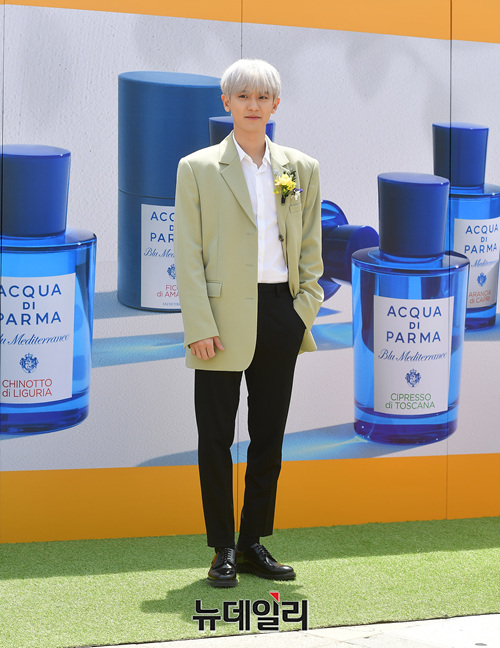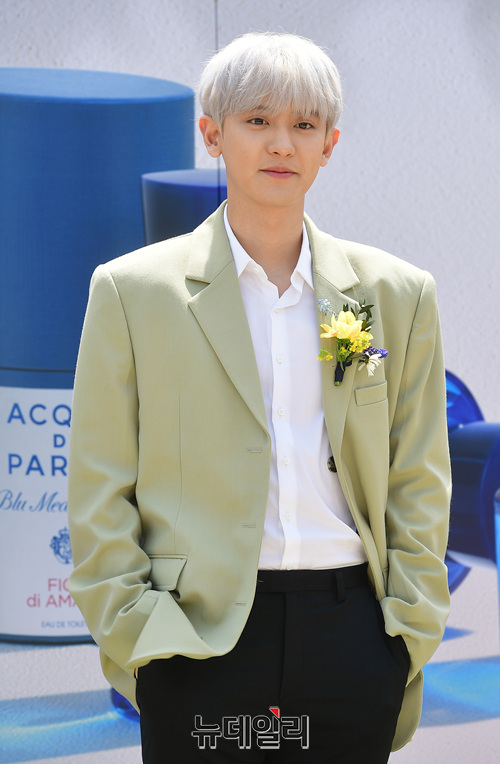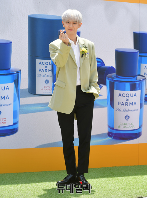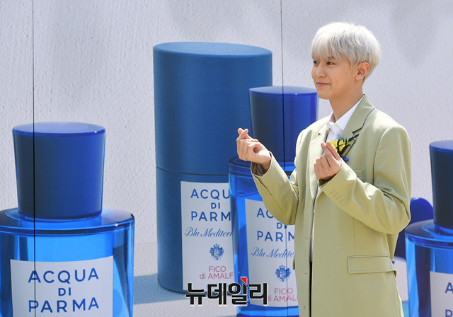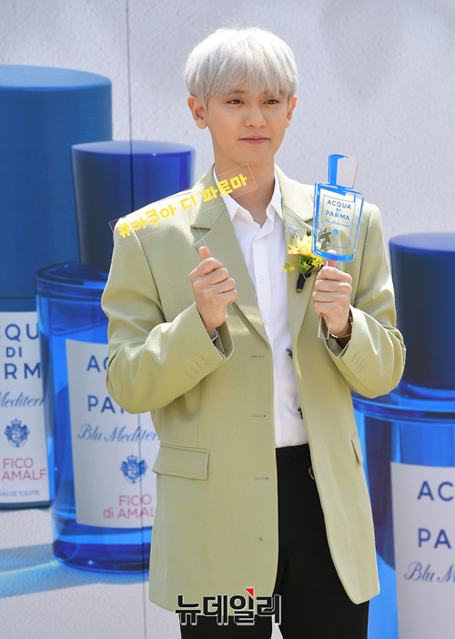 엑소 찬열이 9일 오후 서울 중구 반얀트리 클럽 앤 스파 서울에서 열린 향수 브랜드 '아쿠아 디 파르마' 런칭 기념행사에서 포토타임을 갖고 있다.