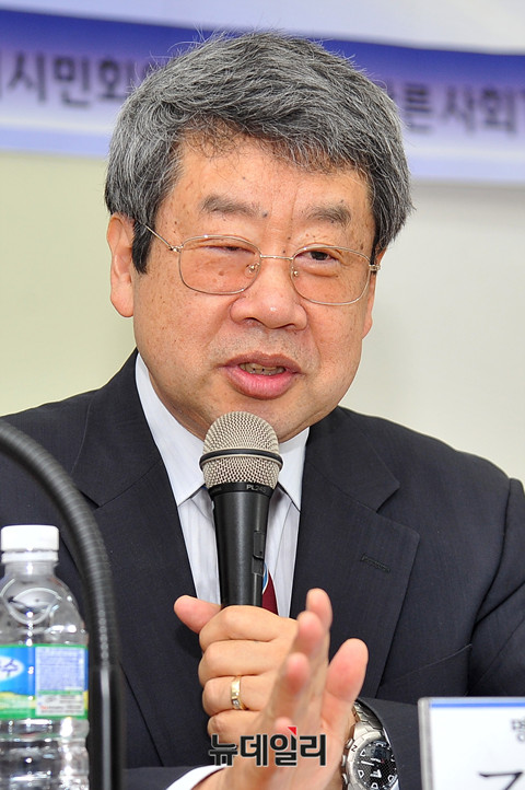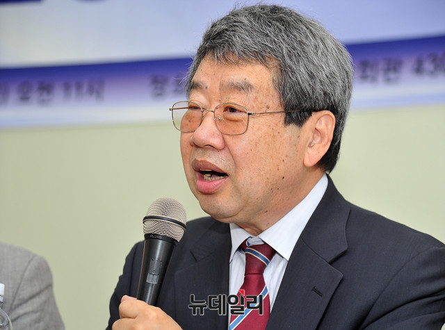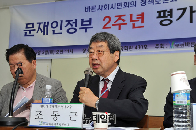 조동근 명지대 경제학과 명예교수가 9일 오전 서울 프란치스코교육회관에서 열린 바른사회시민회의 주최 '문재인정부 2주년 평가토론회'에 참석해 '취임사에 숨겨진 예견된 실패 - 설계주의와 국가주의에 함몰된 경제운영'을 주제로 발제를 하고 있다.이날 토론회는 이영조 경희대 국제대학원 교수가 사회를 맡았다. 발제에는 조동근 명지대 경제학과 명예교수, 양준모 연세대 경제학과 교수, 박인환 변호사, 이인철 변호사, 이지수 명지대 정치외교학과 교수가 나섰다.