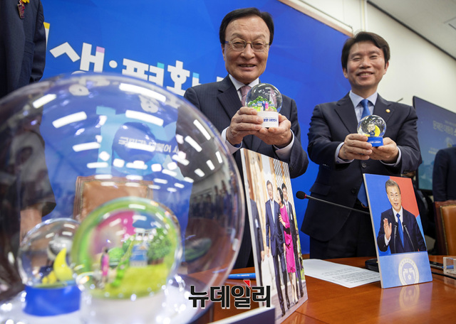 이해찬 더불어민주당 대표와 이인영 원내대표가 9일 국회에서 열린 '문재인 정부 출범 2주년 기념 굿즈 런칭 행사'를 갖고 있다. 이날 공개한 굿즈(기념품)는 오는 13일 더불어민주당 홈페이지에서 구매할수 있다.