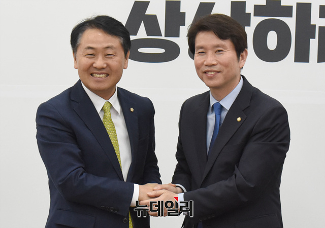 이인영 더불어민주당 신임 원내대표가 9일 국회에서 김관영 바른미래당 원내대표를 만나 악수를 나누고 있다.