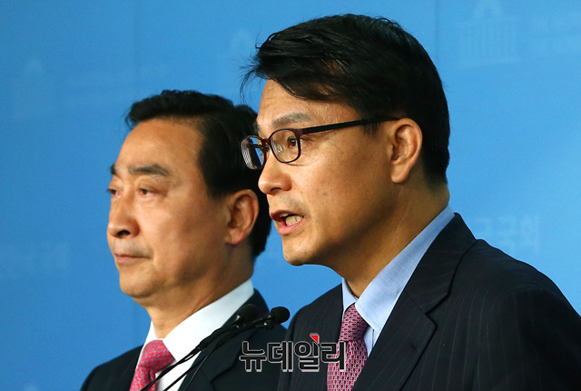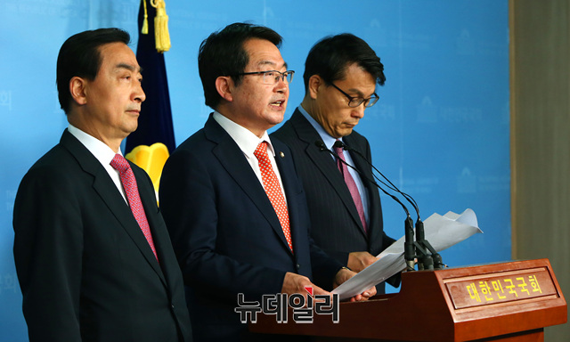 윤상현 국회 외교통일위원장 10일 오전 국회 정론관에서 기자회견을 갖고 북핵외교안보특위 성명서를 발표하고 있다. (왼쪽부터 전옥현 북핵외교안보특위 자문위원, 윤 위원장, 백승주 의원)