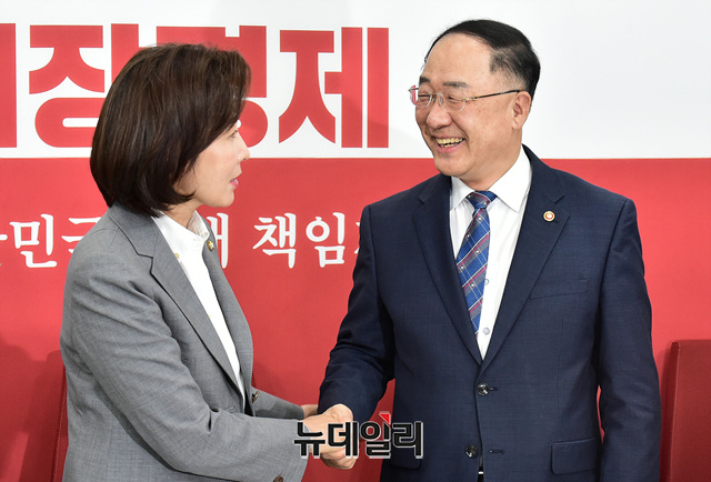 나경원 자유한국당 원내대표가 10일 오후 국회를 찾은 홍남기 경제부총리 겸 기획재정부장관의 예방을 받고 악수를 나누고 있다.