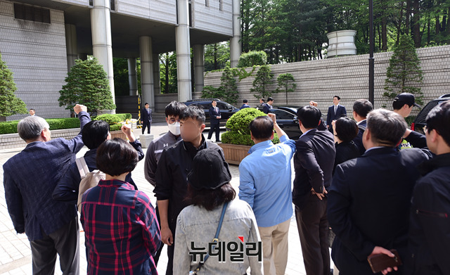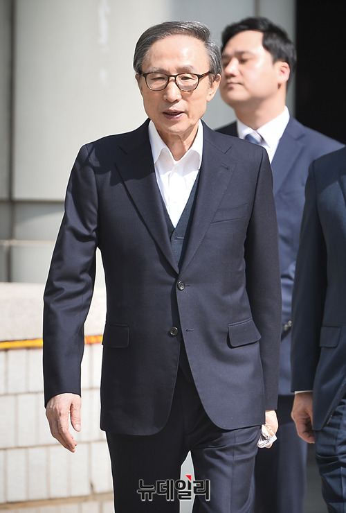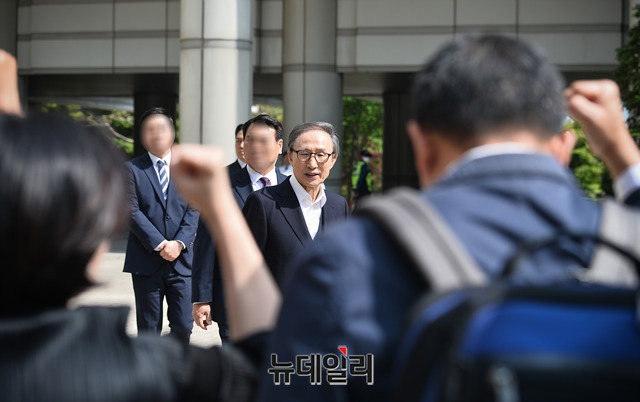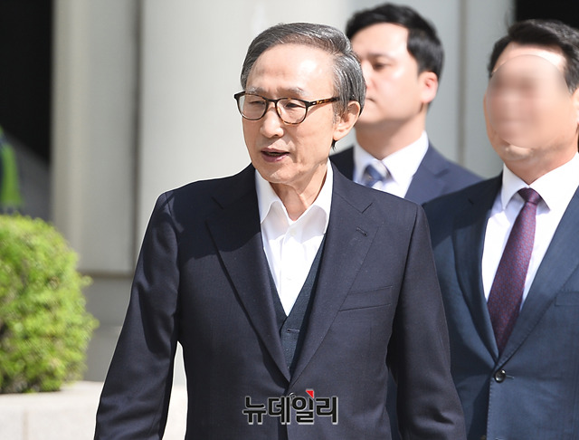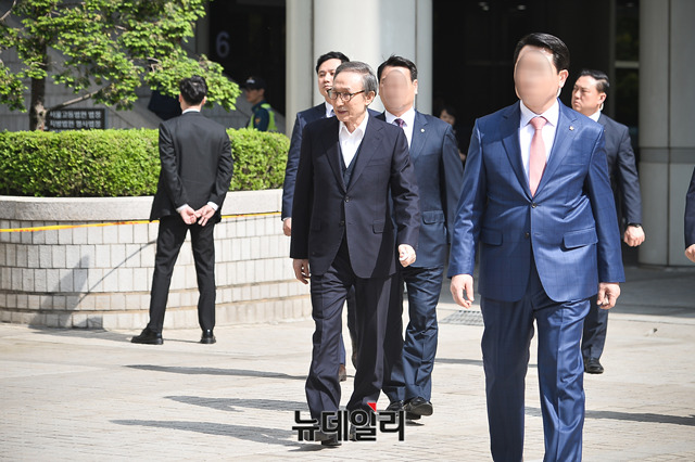 이명박 전 대통령이 10일 오후 서울 서초구 서울고등법원에서 항소심 공판을 마치고 지지자들의 환호를 받으며 법정을 나서고 있다. 이날 이 전 대통령의 사위 이상주 변호사가 증인으로 출석할 예정이었으나 불출석했다. 법원은 이달 말 이 전 대통령의 항소심 심리를 마무리하기로 했다.