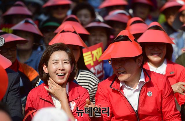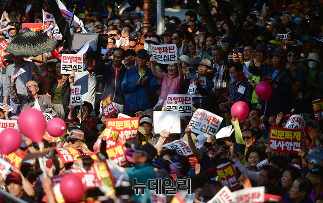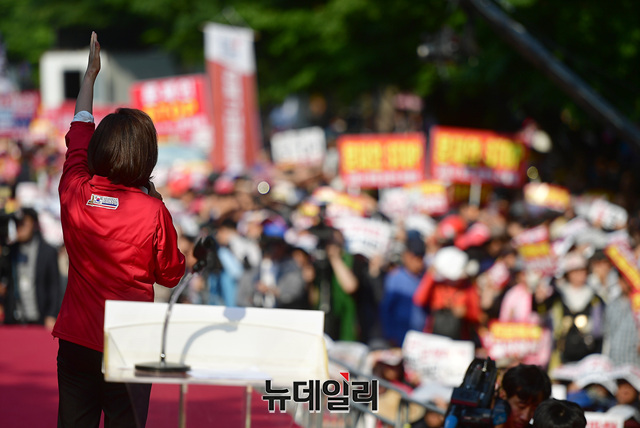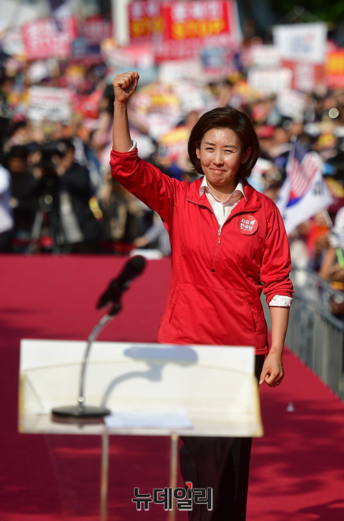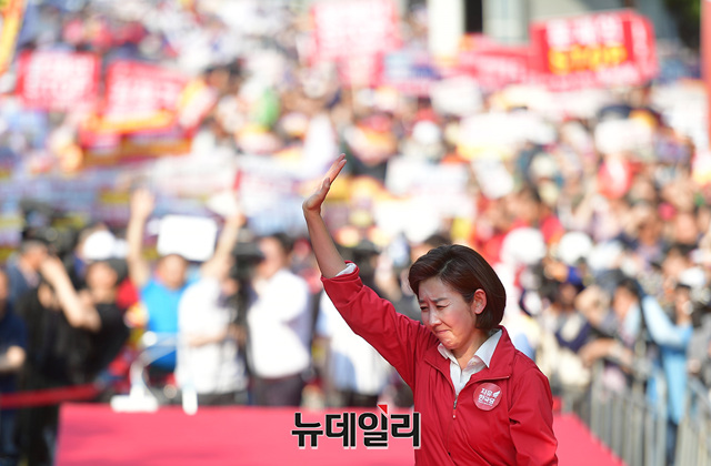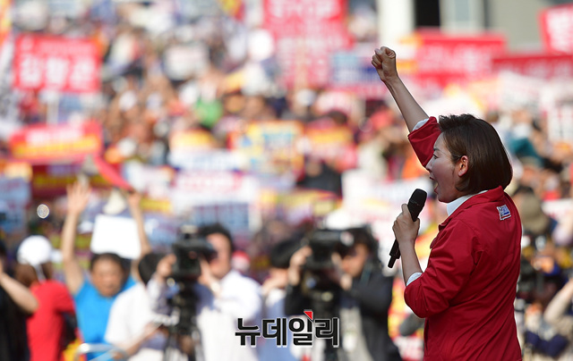 나경원 자유한국당 원내대표가 11일 오후 대구 달서구 대구문화예술회관 앞에서 열린 문재인 정권 규탄 4차 장외집회에서 구호를 외치고 있다. 이날 규탄집회에는 대구·경북 지역과 부산·경남 지역에서도 많은 지지자들이 참석했다.