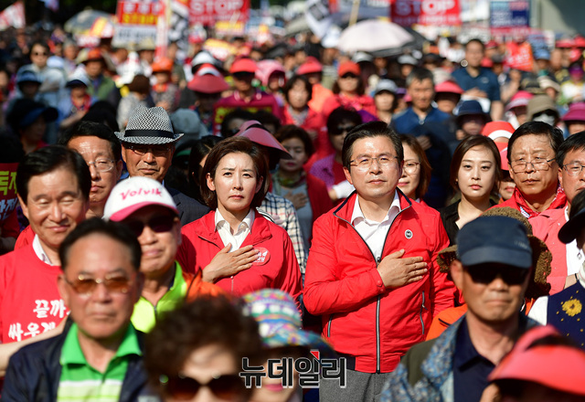 황교안 자유한국당 대표와 나경원 원내대표가 11일 오후 대구 달서구 대구문화예술회관 앞에서 열린 문재인 정권 규탄 4차 장외집회에서 국민의례를 하고 있다. 이날 규탄집회에는 대구·경북 지역과 부산·경남 지역에서도 많은 지지자들이 참석했다.