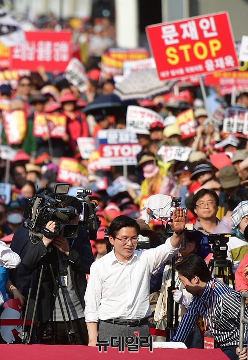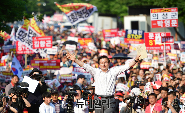 황교안 자유한국당 대표가 11일 오후 대구 달서구 대구문화예술회관 앞에서 열린 문재인 정권 규탄 4차 장외집회에 지지자들의 환호를 받으며 단상에 오르고 있다. 황 대표는 문 정권의 경제실정을 담은 징비록을 들고 단상에 올랐다.
