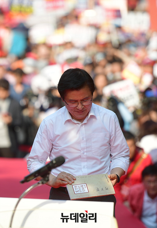 [포토] 환호받으며 단상오르는 황교안 대표...한손엔 징비록