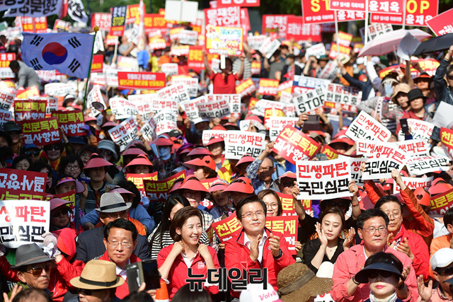 곽대훈 자유한국당 대구시당위원장과 대구지역 의원, 당협위원장이 11일 오후 대구 달서구 대구문화예술회관 앞에서 열린 '문재인 정권 규탄 4차 장외집회'에서 발언을 하고 있다.이날 최고기온이 30도를 넘은 초여름 날씨에도 대구·경북 지역과 부산·경남 지역에서 많은 지지자들이 문 정권을 규탄하는 손피켓을 들고 장외집회에 참석했다.앞서 황 대표와 지도부는 경부선과 호남선을 따라 이동하며 규탄대회를 각각 개최했다. 이어 장외 투쟁을 전국으로 확대해 부산, 경남 거제·통영, 울산에 이어 대구를 찾았다. (대구=정상윤 기자)