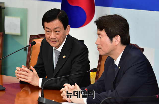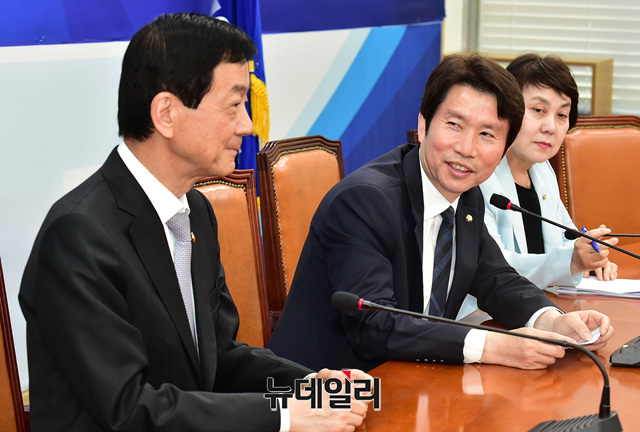 이인영 더불어민주당 원내대표가 13일 오전 국회에서 진영 행정안정부 장관의 예방을 받고 환담을 나누고 있다.
