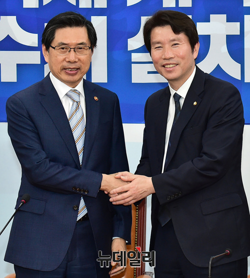 이인영 더불어민주당 원내대표가 13일 오전 국회에서 박상기 법무부 장관의 예방을 받고 인사를 나누고 있다.