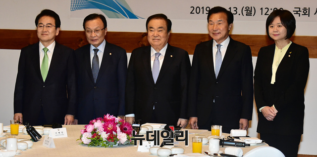 문희상 국회의장과 여야 4당 대표(이해찬 더불어민주당 대표, 손학규 바른미래당 대표, 정동영 민주평화당 대표, 이정미 정의당)가 13일 오후 국회 사랑재에서 열린 '초월회' 모임에 참석해 기념 사진을 촬영하고 있다. 이날 황교한 자유한국당 대표는 일정을 이유로 불참했다.