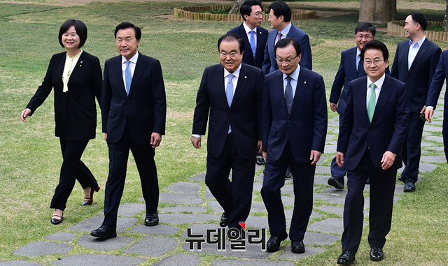 문희상 국회의장과 여야 4당 대표(이해찬 더불어민주당 대표, 손학규 바른미래당 대표, 정동영 민주평화당 대표, 이정미 정의당)가 13일 오후 국회 사랑재에서 열린 '초월회' 모임에 참석하기 위해 입장하고 있다. 이날 황교한 자유한국당 대표는 일정을 이유로 불참했다.