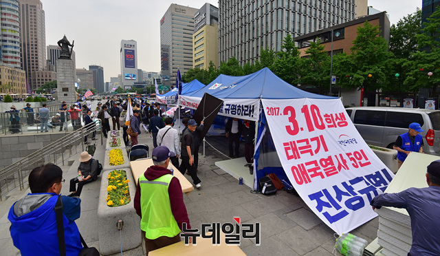 대한애국당이 지난 10일 서울 광화문광장에 설치한 '3‧10애국열사추모천막'에 13일 오후 샌드위치판넬을 바닥에 설치하는 작업을 진행하고 있다. 기상청은 오후부터 서울지역에 비가온다고 예보했다.서울시는 13일 오후 8시까지 천막을 자진철거하라는 행정대집행 계고장을 애국당에 보냈다. 해당 기간까지 자진철거가 이뤄지지 않을 경우 강제철거에 들어갈 것으로 예상된다.대한애국당이 설치한 '3‧10애국열사추모천막'은 지난 2017년 3월 10일, 서울 중구 헌법재판소 인근에서 박근혜 전 대통령 탄핵심판사건 선고의 '탄핵 각하'를 주장하며 모인 시민들 중 5명이 사망하고, 행방불명된 시민들의 진상규명과 명예회복을 알리기 위해 설치됐다.