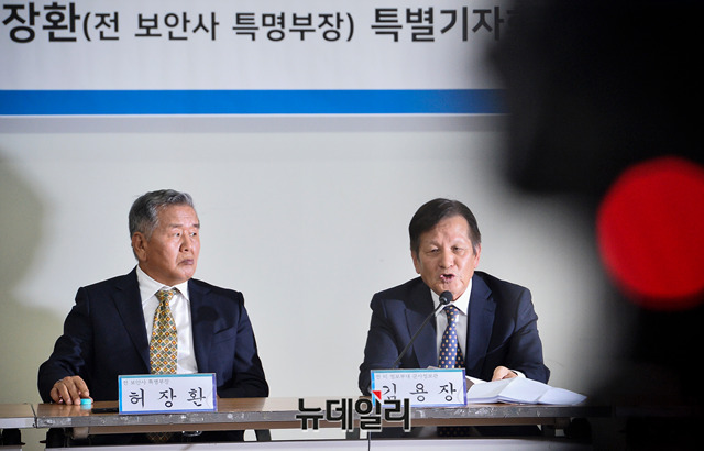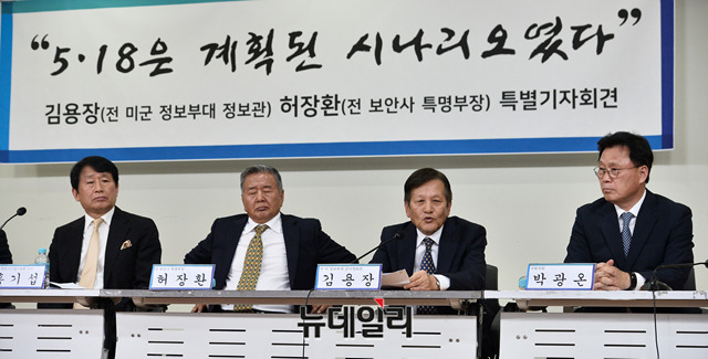 김용장 전 미 정보부대 군사정보관이 13일 오후 국회 의원회관에서 열린 '5.18은 계획된 시나리오였다' 특별기자회견에서 다시 상황에 대해 증언하고 있다.