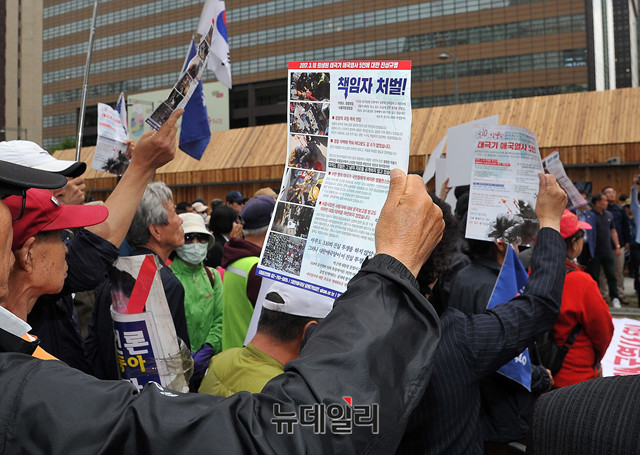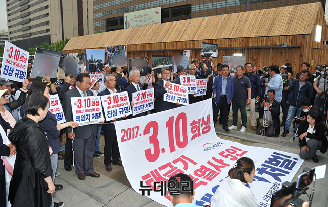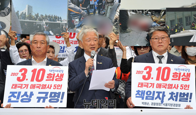 서석구 변호사가 13일 오후 서울 종로구 광화문광장에서 열린 태극기 애국열사 5인 진상규명 및 책임자 처벌촉구 기자회견에 참석해 발언하고 있다.대한애국당이 지난 10일 광화문광장 이순신장군 동상 옆에 설치한 '3‧10애국열사추모천막'은 지난 2017년 3월 10일, 서울 중구 헌법재판소 인근에서 박근혜 전 대통령 탄핵심판사건 선고의 '탄핵 각하'를 주장하며 모인 시민들 중 5명이 사망하고, 행방불명된 시민들의 진상규명과 명예회복을 알리기 위해 설치됐다.