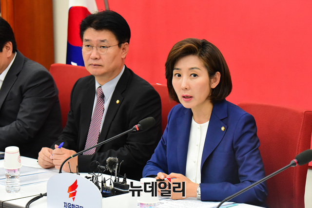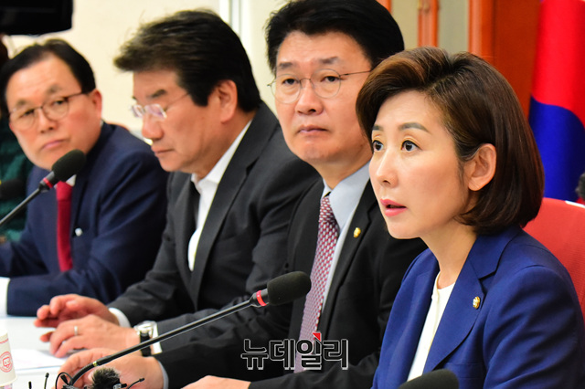나경원 자유한국당 원내대표가 14일 오전 국회에서 열린 '5대 중점 정책특위 연석회의'에 참석해 모두발언을 하고 있다.