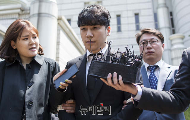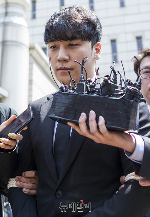 버닝썬 자금 횡령, 해외 투자자 성매매 알선, 성매매 등의 혐의를 받는 가수 승리가 14일 오전 서울 서초구 서울중앙지법에서 열린 영장실질심사를 마친 뒤 포승줄에 묶인 채 호송차로 이동하고 있다.