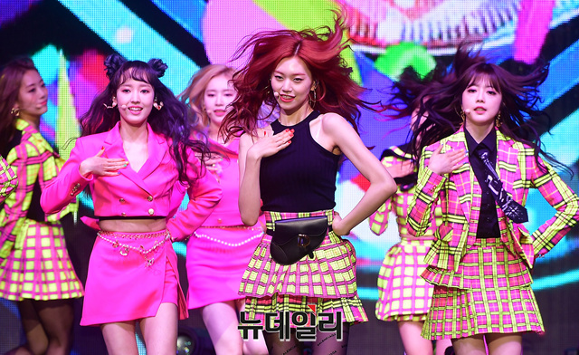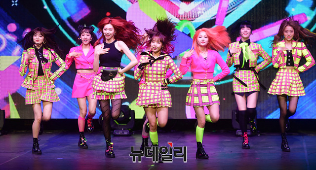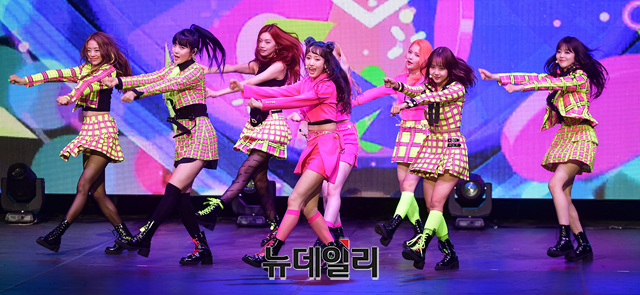 걸그룹 위키미키(Weki Meki)가 14일 오후 서울 용산구 블루스퀘어에서 열린 2번째 싱글앨범 'LOCK END LOL(락앤롤)' 쇼케이스에서 수록곡 무대를 선보이고 있다.