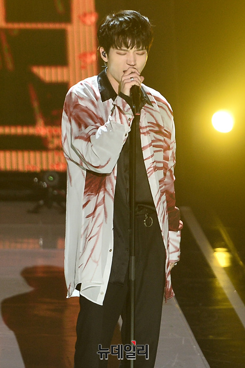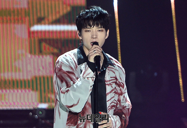 가수 남우현이 14일 오후 서울 마포구 SBS 프리즘타워에서 열린 SBS MTV '더 쇼(THE SHOW)' 생방송에서 무대를 선보이고 있다.