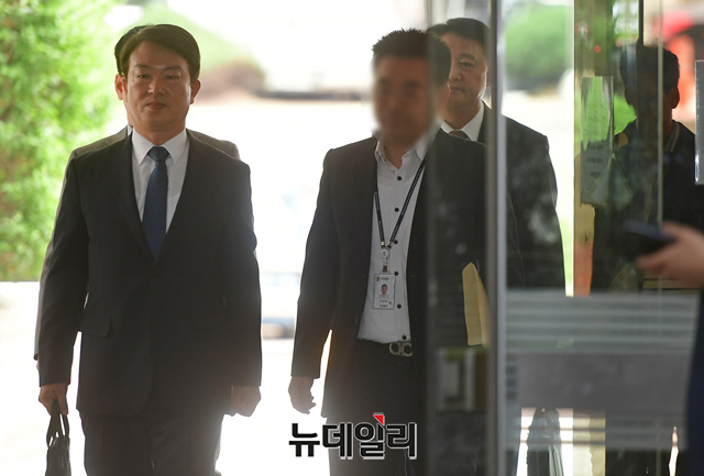 강신명(앞쪽), 이철성 전 경찰청장이 15일 오전 서울 서초구 서울중앙지법으로 구속 전 피의자 심문(영장실질심사)을 받기 위해 입장하고 있다. 강신명·이철성 전 경찰청장은 경찰의 정치 개입 및 불법사찰 의혹을 받고 있다.