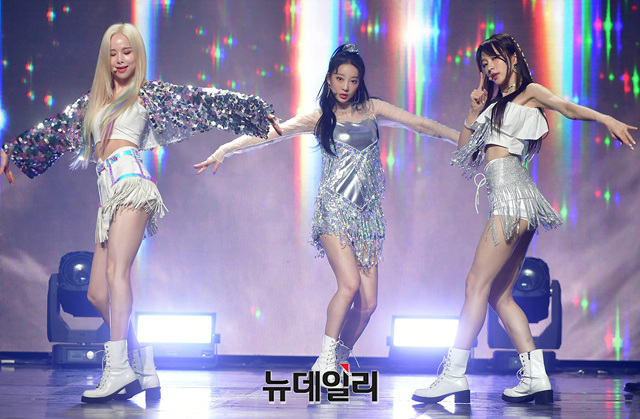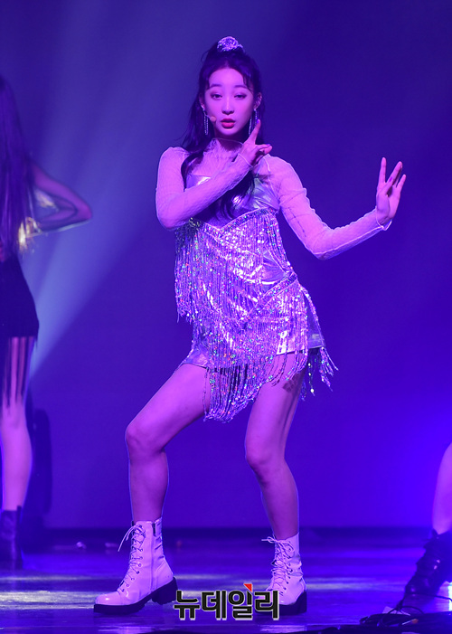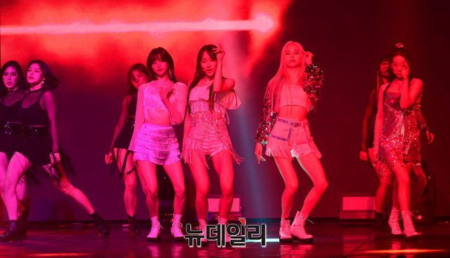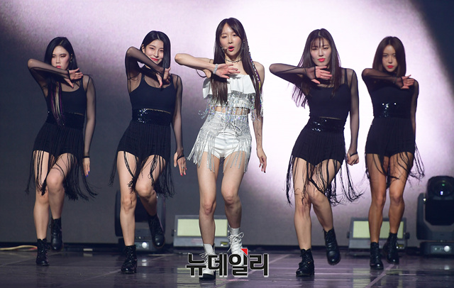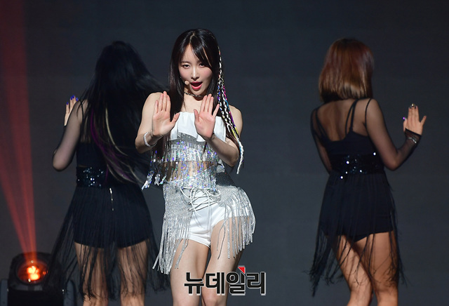 걸그룹 'EXID(이엑스아이디)'가 15일 오후 서울 용산구 블루스퀘어에서 열린 새 미니앨범 'WE(위)' 쇼케이스에서 타이틀곡을 선보이고 있다.