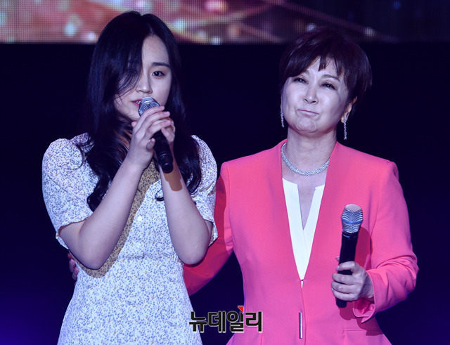 가수 계은숙이 15일 오후 서울 마포구 서강대학교 메리홀에서 열린 새 앨범 'Re : Birth(리 : 벌스) 쇼케이스에서 가수 윤수와 함께 수록곡을 선보이고 있다.
