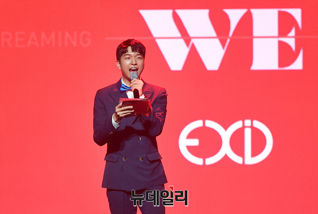 개그맨 유재필이 15일 오후 서울 용산구 블루스퀘어에어 열린 걸그룹 'EXID(이엑스아이디)' 새 미니앨범 'WE(위)' 쇼케이스에서 멤버들을 소개하고 있다.이번 앨범은 재계약을 앞둔 EXID 멤버 5인 완전체가 같은 소속사에서 만드는 마지막 앨범. 이전까지 보여줬던 호소력 짙은 보이스가 바탕이 되던 곡에서 벗어나 DROP을 통해 세련된 변화를 시도했다.타이틀곡 'ME&YOU(미 앤 유)'를 포함해 총7곡을 담았다. 음원은 오후 6시에 공개.