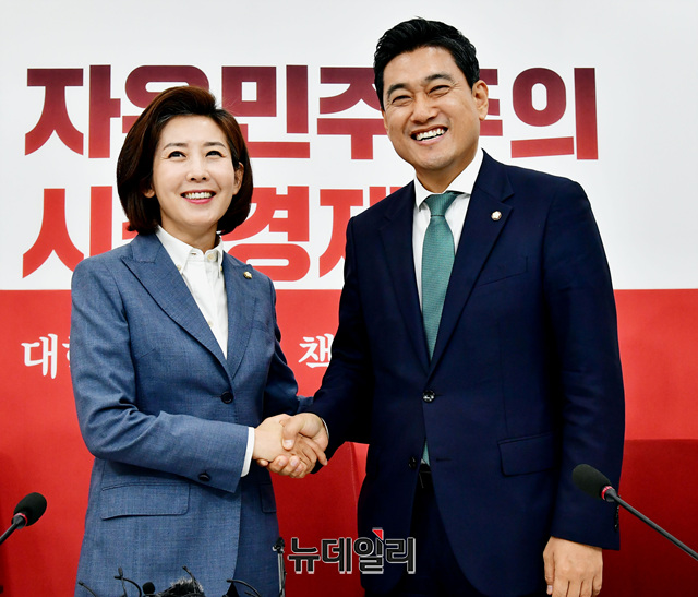 오신환 바른미래당 신임 원내대표가 16일 오전 국회 자유한국당 원내대표실을 찾아 나경원 원내대표를 예방하고 악수를 나누고 있다.