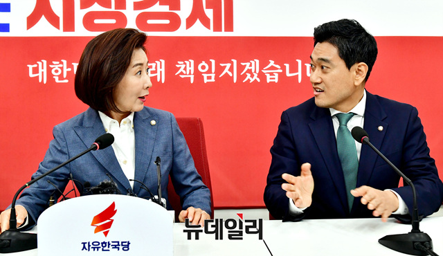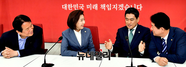 오신환 바른미래당 신임 원내대표가 16일 오전 국회 자유한국당 원내대표실을 찾아 나경원 원내대표를 예방하고 환담을 나누고 있다.