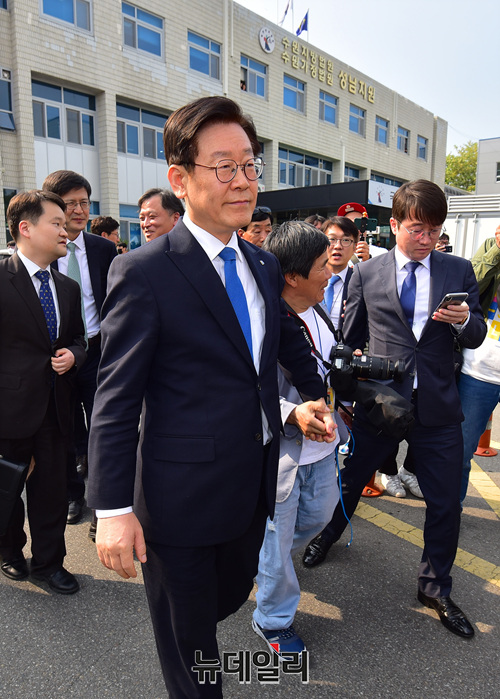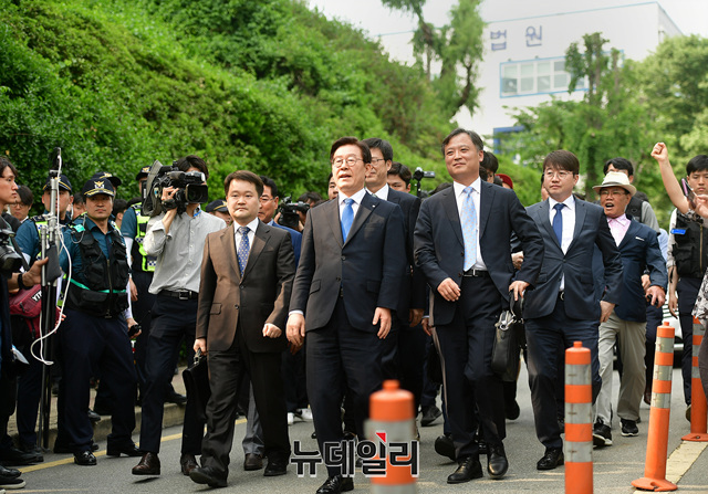 직권남용과 공직선거법 위반 혐의로 기소된 이재명 경기지사가 16일 오후 경기 성남시 수원지법 성남지원에서 열린 선고공판 직후 법정에서 나와 기다리던 지지자들이 있는 법원 입구까지 걸어서 이동해 지지자들에게 손을 흔들어 화답하고 있다. 이 지사는 이날 선고공판에서 혐의 모두 무죄를 받았다. (경기 성남=정상윤 기자)