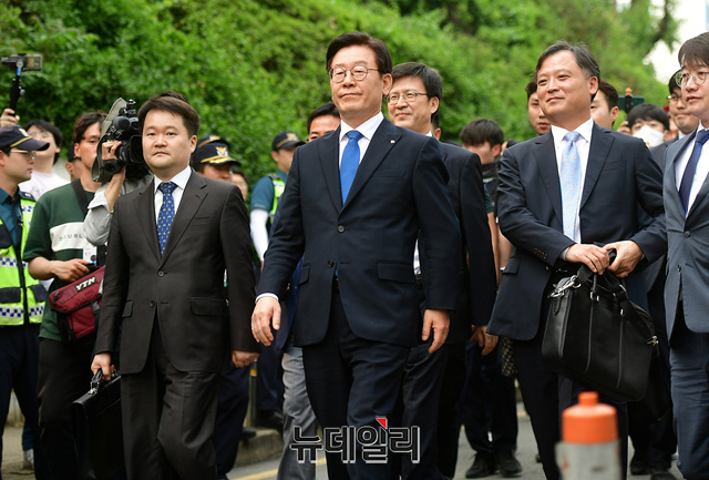 [포토] 법원입구서 기다리던 지지자에게 화답하는 이재명